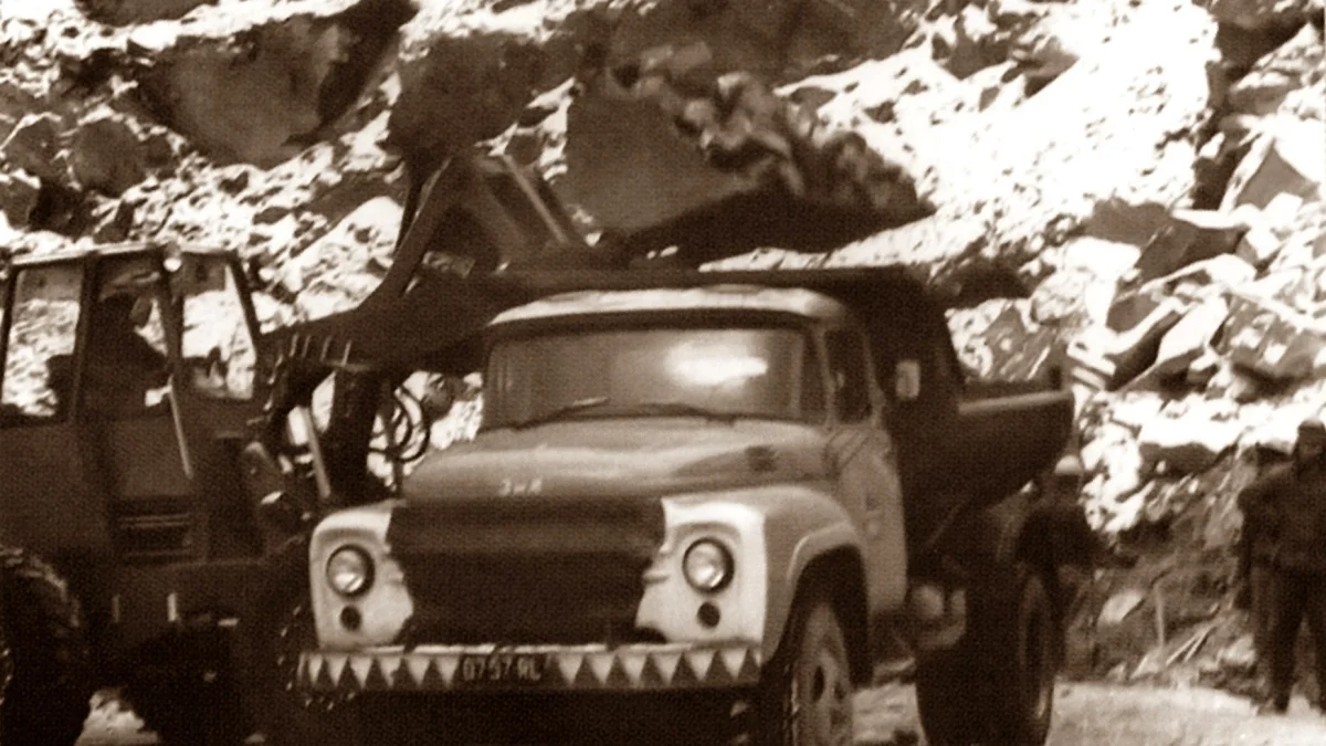 Zdjęcie zostało wykonane w latach 1971-1973, prawdopodobnie w okresie późnej jesieni bądź podczas wczesnego ataku zimy. Świadczą o tym przyprószone śniegiem skały i ciepłe ubranie robotnika stojącego w tle. Ładowarka napełnia urobkiem skrzynię ładunkową samochodu ciężarowego produkcji radzieckiej marki Ził. Była to w tamtych czasach bardzo popularna w Polsce ciężarówka, oglądana często na bieszczadzkich drogach.