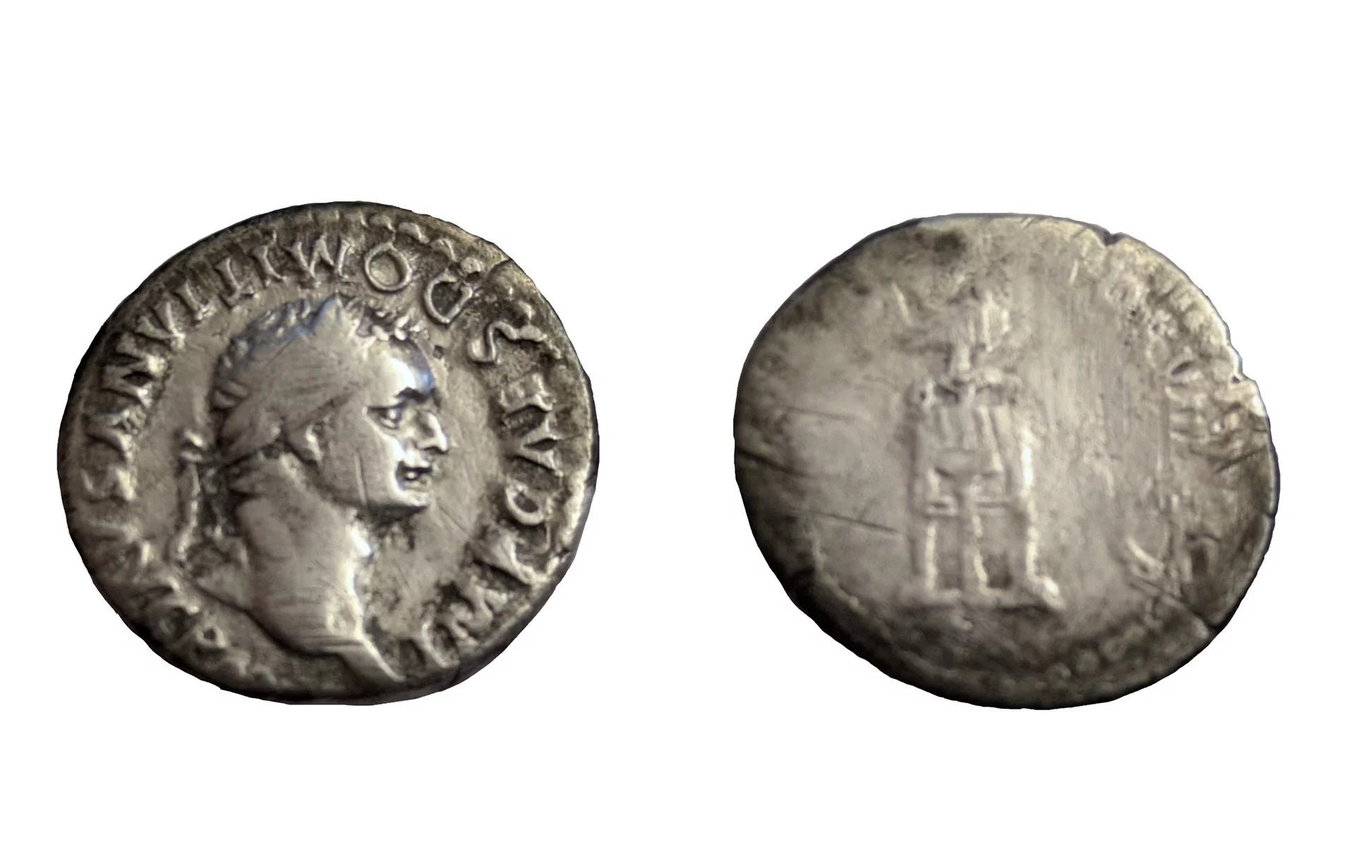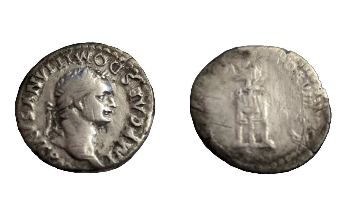Tymczasem w styczniu 2025 roku pan Sławomir przekazał kolejne cenne znaleziska. Wśród nich znalazły się dwie brązowe fibule z okresu rzymskiego oraz doskonale zachowany denar cesarza Domicjana, panującego w latach 81-96. Moneta ta, dzięki swojemu zachowaniu, dostarcza bezpośrednich dowodów na obecność tej kultury na opisanym terenie. Na awersie monety widnieje popiersie cesarza zwrócone w prawo, podczas gdy rewers przedstawia trójnóg z siedzącymi na nim ptakami oraz delfina, co świadczy o wysokim poziomie rzemiosła artystycznego tamtych czasów.